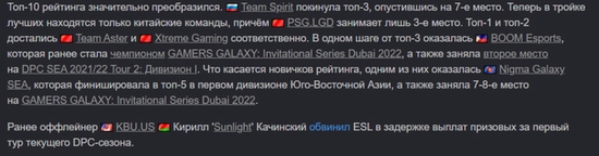 早些时候,来自KBU.US战队的三号位白俄罗斯选手Sunlight指责ESL拖欠了当前 DPC 赛季第一轮的奖金。