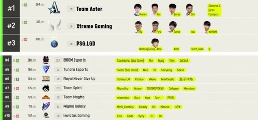 前10名的排名发生了显着变化。来自俄罗斯的Spirit战队离开前三名,跌至第七位。现在只有中国队进入前三名,但中国区目前排名第一的PSG.LGD战队仅排在第三位。