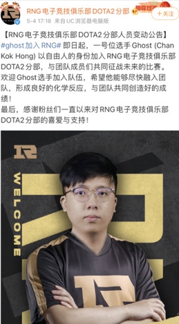 RNG电子竞技俱乐部DOTA2分部在其官博上宣布:前SAG一号位选手,来自马来西亚的Ghost加入队伍。