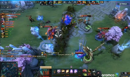 22分钟EHOME开雾,船长三连配合凤凰烈日炙烤击杀了小骷髅,与此同时RNG上路四人组也击杀了剑圣,船长凤凰到上路再将RNG火女暗影萨满玛尔斯三人击杀,这波EHOME二换四。