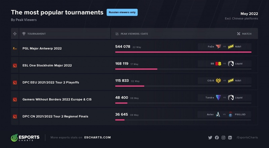 根据知名网站Esports Charts数据统计,在5月份的所有电子竞技赛事中,Valve出品的游戏CS:GO与Dota2相关比赛霸榜俄区观众数前五(未统计中国平台数据)。