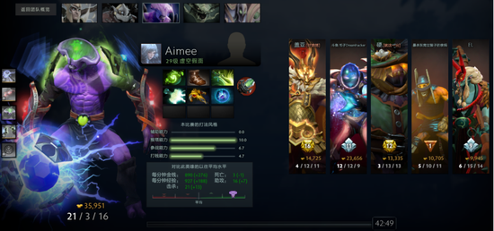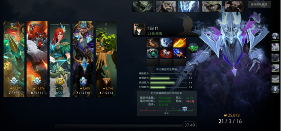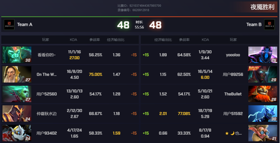 时长最短的比赛仅有10:33,天辉方拿出来了这个版本再次热门的帕吉,在队友的帮助下直接打穿中路,夜魇方早早就打出GG。