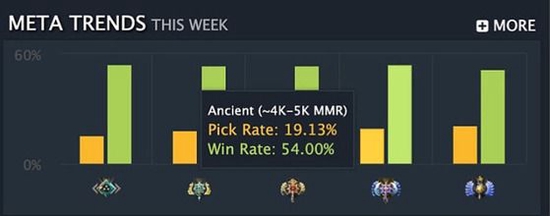 技能变化导致英雄热度下降是很明显的,但是他的强大却鲜被人注意到,来看一下数据统计:首先是英雄在DPC西欧S级联赛的胜率 - 83.3%(10/12的胜率)。其次是本月最后一周的匹配胜率表现:宙斯在超凡以下段位的胜率都超过了50%(中军及以下 - 53.7%;统帅 - 51.3%;传奇 - 54%),接下来想分析以下宙斯悄悄崛起的原因:
