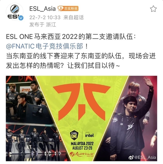 ESL ONE马来西亚2022的第二支邀请队伍:Fnatic电子竞技俱乐部!