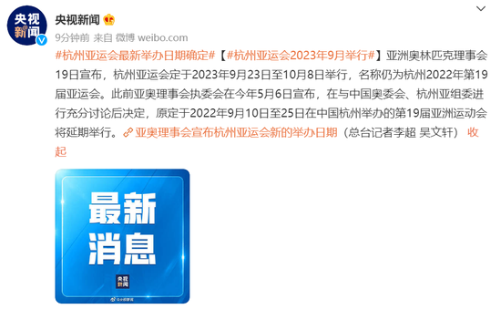 亚洲奥林匹克理事会19日宣布,杭州亚运会定于2023年9月23日至10月8日举行,名称仍为杭州2022年第19届亚运会。此前亚奥理事会执委会在今年5月6日宣布,在与中国奥委会、杭州亚组委进行充分讨论后决定,原定于2022年9月10日至25日在中国杭州举办的第19届亚洲运动会将延期举行。(总台记者李超 吴文轩)