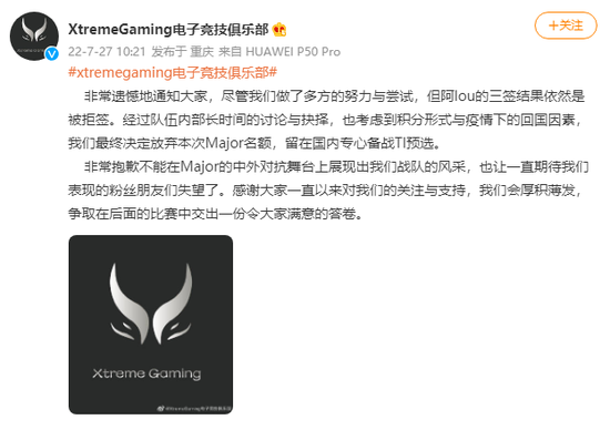 来源:@XtremeGaming电子竞技俱乐部 微博