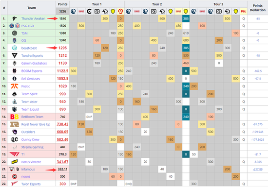 Beastcoast的DPC之旅其实也算一帆风顺,压在他们头上的只有一个Thunder Awaken。TA与beastcoast两兄弟基本囊括了南美所有DPC联赛的一二名,当然也包括DPC积分。南美三哥INF.U只得抱着可怜的332分含恨参加TI11地区预选赛。