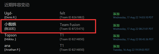 根据DOTA职业巡回赛登记页面显示,选手小蜘蛛(Victoria)加入到了Team Fusion的阵容名单之中。