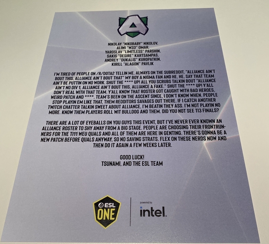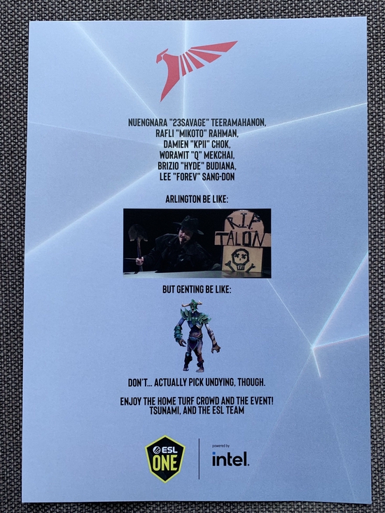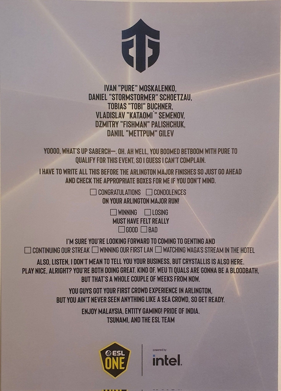 目前,各队已经陆续抵达云顶,准备参加ESL马来西亚站的比赛。主办方在他们的房间中准备了零食、礼物,以及一封十分用心的欢迎信。各个战队也纷纷在社交平台上晒出了欢迎信的截图,我们进行了整理和翻译以供各位玩家阅读。
