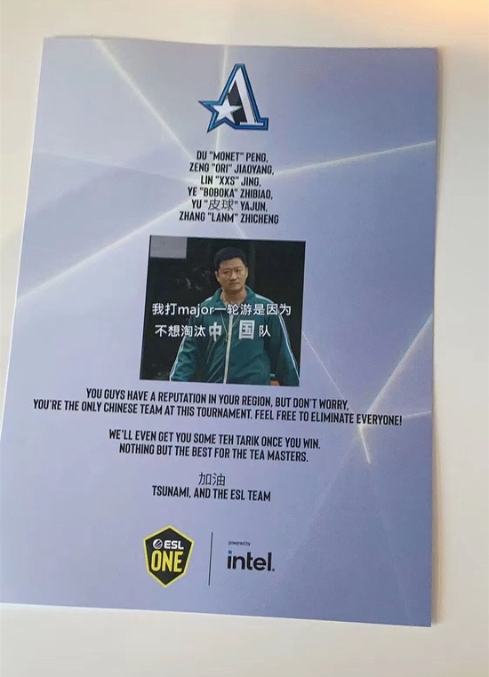 加油!Tsunami(知名英文解说)和ESL团队敬上(各队欢迎信中均有这句话,因此之后不再重复)。