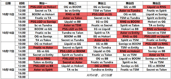 TI11小组赛赛程在刚刚公布,本次小组赛在10月15日~18日进行,所有战队分为两个小组,进行BO2单循环积分赛。除18日外,每天进行五轮比赛,每轮比赛五场同开。