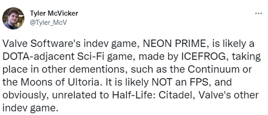Valve正在开发的新项目NEON PRIME很可能是由Icefrog制作的DOTA背景的科幻游戏,发生在DOTA2世界的其他维度,例如Continuum或Moons of Ultoria(Continuum指延魔战团,在天地迷宫里也有出现,两个词均出自玛尔斯的背景故事)。大概率不是FPS游戏,显然,和V社正在开发的另一款游戏——《半条命:要塞/堡垒》无关。
