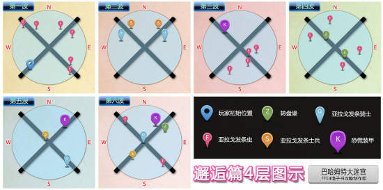 一共会刷新6波怪,每波之间的刷新间隔是60秒,到了时间后新一波的怪会定时定点刷新,图中已标出每波怪的刷新点。