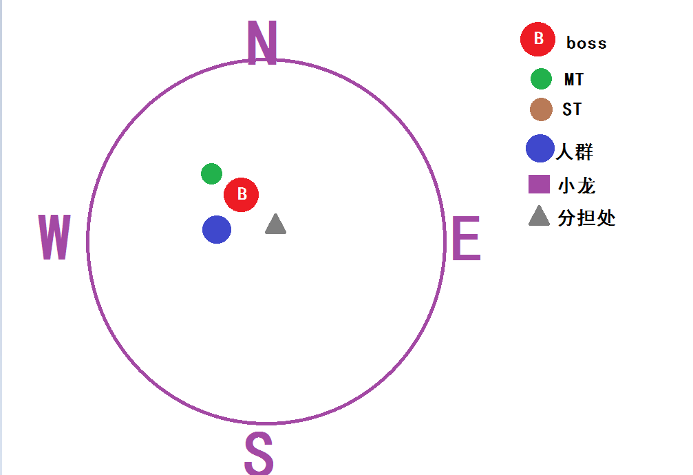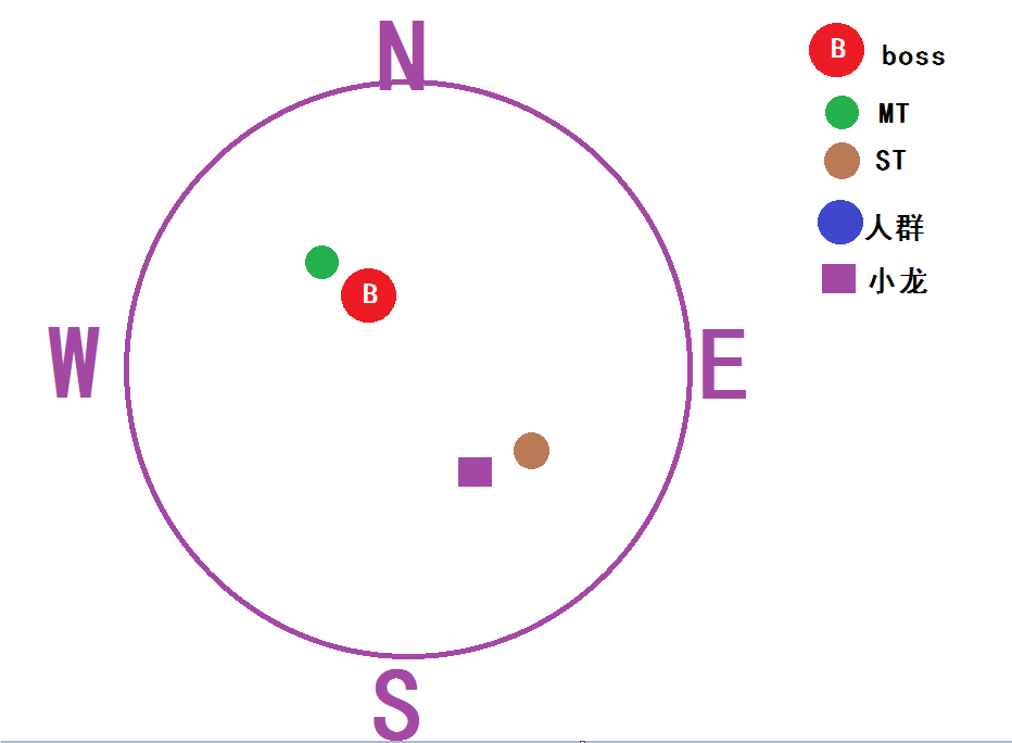 阶段流程:本阶段由拉小龙的T起手接BOSS和三条小龙,之后拉BOSS的MT立即嘲讽走BOSS拉到位置,其他人全部分散站位,DPS先击杀三只小龙,站位如图一