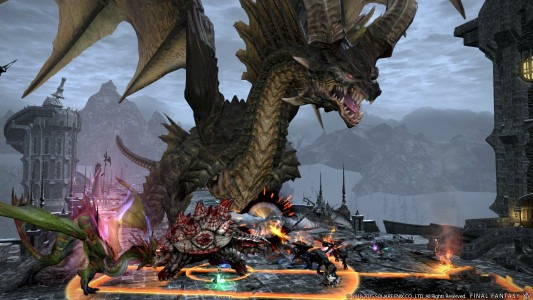 剧情的结局将如何发展至“苍天的伊修加德”呢? 在本次发表的截图中出现了巨龙“ヴィシャップ(Višap)”,再加上战斗中有各式龙族援军出现,可以预想到将有非常激烈的战斗等待着玩家。