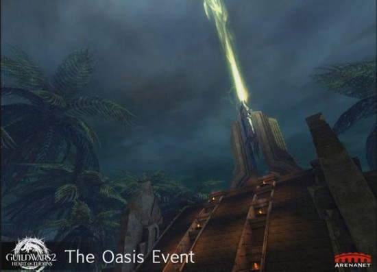 这 个事件每三个小时发生一次,绿洲事件在地图的中心出现。在绿洲的中心是一个金色的寺庙,它拥有着巨大的能量武器。玩家将需要从附近的恐龙或者其他野生动物 身上收集能源核心,并把它们带到金色寺庙周围的三个小修道院里才能够为武器充能(任何玩家任何队伍可以把能源核心带到任何一个小修道院里,这些核心没有颜 色区别)(也就是说全地图的玩家收集的都算在一起,最后谁抢到操控权算谁的)