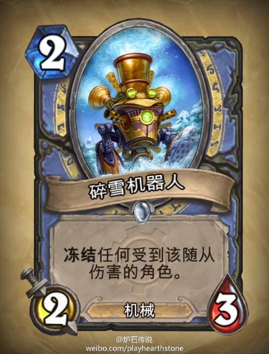 当魔法遇上科技,当法师遇上机械!《炉石传说》扩展包全新卡牌:碎雪机器人,中国首曝。“让冰霜的力量冻结一切,请称呼我吉安娜·暴雪!”PS:配合机械零件,味道更佳。