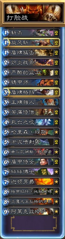 加入了盾甲侍女的土豪战卡组在游戏中期的站场能力加强了许多,同时配合着强势的小斧头和死亡之咬几乎不怎么需要看脸的大乱斗。另外,你手里有没有大乱斗不重要,关键是只要战士还没放过乱斗,除了速攻卡组都不会showhand铺场的。(即便是速攻也会在你5费时收敛一番)当然,以后等别人都觉得战士不会放乱斗了,你再把它加进去。