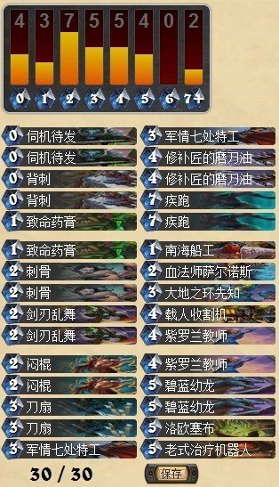 卡组本身并无什么特殊之处,本以为是自己改良的更适合国服环境的刀油贼,结果去X鱼一看,大家差不多都改成了这个样子,和哀绿的卡组甚至一模一样。国服环境如此,建议大家原封不动抄,卡组本身无任何问题,强度极高,难度极低,造价更低。