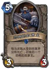 这套牌的思路是通过大量的过牌和武器压缩牌库,同时控制对手的场面,中期依靠奴隶主和其他生物取得场面的优势,最后打死对手。这套卡组中有很多的配合,比如暴乱狂战士在场的时候战歌指挥官+奴隶主很容易就能打出30+的伤害,蹒跚食尸鬼和死亡之咬也是配合奴隶主的利器,这套卡组能够打出的配合很多,需要大量的练习,我在天梯打了大约50盘,仍然不断地犯错。但是强度我觉得是十分惊人的,因为很多职业很难再没有场面的情况下杀死2个满血的奴隶主,而且战歌+奴隶主对于低攻生物来说就是梦魇,特别清除砰砰小怪的时候会十分的酸爽,下面我来介绍下这套卡组的单卡: