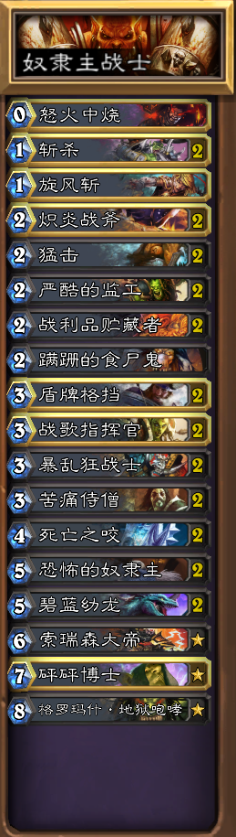大家好,我是战旗主播温酒斩华佗。最近由于工作和生活原因,比较的繁忙,很久没有发表有关炉石的帖子了,今天我给大家带来了一套我自己的战士卡组,卡组以奴隶主为主引型,所以就命名为奴隶主战士吧。首先先上卡组: