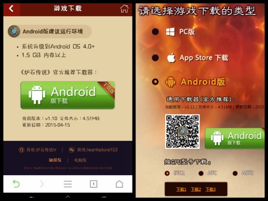 2015年4月15日,炉石的手机客户端正式发布,相比苹果手机用户简单的4S及以上版本可玩而言,安卓机用户们的体验就没那么理想了——官方提供的通用下载器下载的游戏版本为通用版本,非常多的安卓手机都没办法获得流畅的游戏体验。