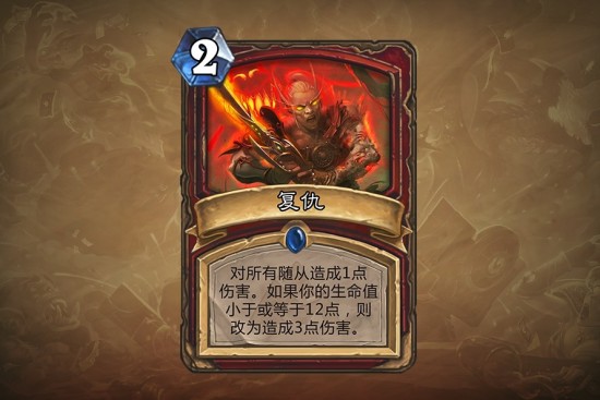 点评:任何一个曾经使用过战士的玩家都会知道这个职业的一个最大的缺点就是缺乏清场(绝命乱斗是一张史诗),这张牌将会在一定程度上解决这个问题:这张牌最差的情况下是一张贵了一飞的旋风斩而最好的情况下是便宜了一半的地狱烈焰。我觉得这张牌的问题是它的三点伤害的触发条件有点微妙,当你生命很低的时候往往是七回合以后了,场上都是大个随从,作为清场来说伤害未必够用。简而言之,战士的AOE很成问题,而这张牌并不能真正弥补这个缺陷。当然,我想在竞技场中大部分时间它都是一个两费的旋风斩,因此复仇打击的机会成本比较低。我的建议是如果你的套牌中需要有一张有旋风斩效果的牌的话,复仇打击还是很不错的,因为它的费用不高,而且有时候可以高效地清场。