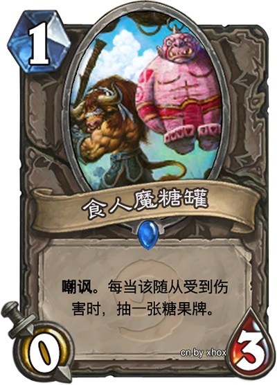 个人在这期中最喜欢的卡牌是食人魔糖罐,主要是卡图和效果都比较有趣,还一定意义上致敬了魔兽里的糖果(吃多了会恶心)