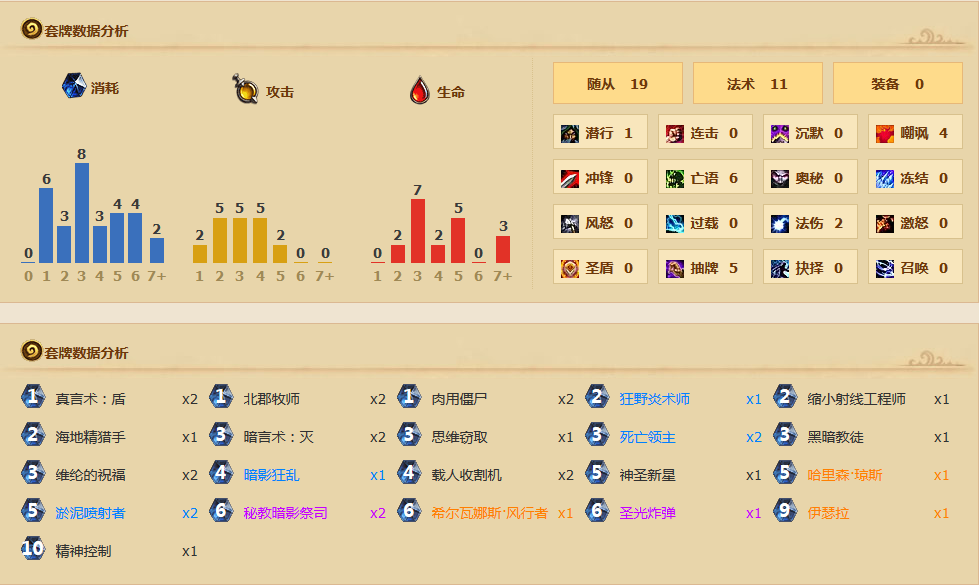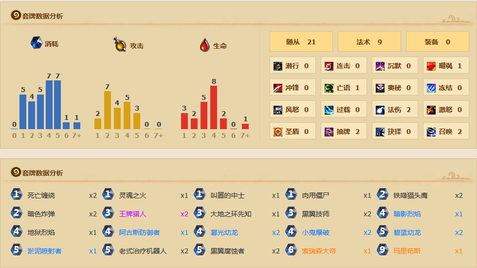 这套卡组非常针对当前的主流卡组。谢娜无疑是很恶心猎人的一张随从。烈焰风暴则是针对奴隶战的AOE,事实也证明了对付奴隶战只需要加一张呼啦就好打很多。