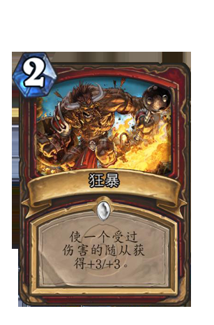 狂暴—— 使一个受过伤害的随从获得+3/+3。 一个随从被怒火中烧后再加上狂暴会是什么样的情况?这是战士专属的一套强力连招。 |