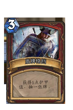 盾牌格挡 —— 获得5点护甲值,抽一张牌。 这张牌在现在看来有些拖节奏,前期打随从更好,不推荐使用,放到后期可以拿来保命用。 |
