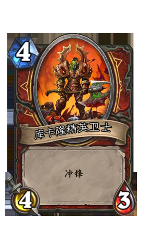 库卡隆精英 —— 冲锋。 战士唯一的一张自带冲锋的小型随从,破铁桶阵、补刀效果都不错。但是由于低血量,很难活过一回合。 |