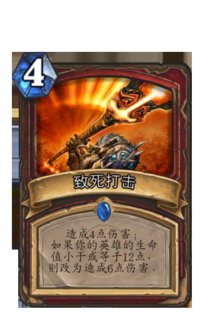 致死打击—— 造成4点伤害;如果你的英雄的生命值小于或等于12点,则改为造成6点伤害。 补刀、清场都不错,但是4点的蓝耗使得用途比较有限。配合卖血流可能会比较好用。 |