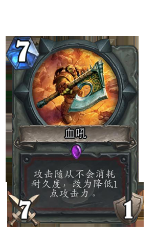 血吼—— 攻击随从不会消耗耐久度,改为降低1点攻击力。 游戏中目前为止最强武器,攻击随从不会消耗耐久,7点攻击配合血帆袭击者与冲锋可以完美的终结比赛。 攻击英雄只可以攻击一次,但可以和升级一起使用。 |