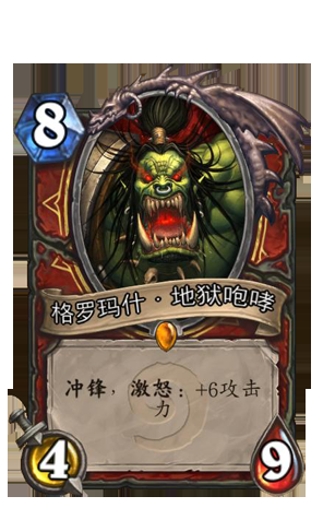 格罗玛什·地狱咆哮 —— 冲锋,激怒:+6攻击力。 老爹牌比赛终结者,需要配合无尽怒火或者其他技能进行激怒,自带冲锋,激怒后10点攻击,比赛后期可以毁灭一切。 如果你有这张牌,请玩战士。如果你玩战士,有了这张牌,战斗力提升一倍。 |