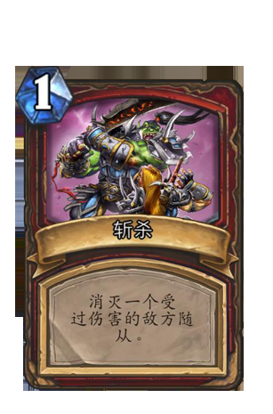 斩杀 —— 消灭一个受过伤害的敌方随从。 战士招牌技能,用于秒杀大型随从,但只能对已经收到过伤害的随从使用。 手上捏一张精灵弓箭手配合非常好用。 |