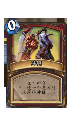 冲锋 —— 在本回合中,使一个友方随从获得冲锋。 让一个随从单体冲锋,0费是亮点,不过光芒被下面的战歌指挥官掩盖。 一般选择指挥官,不过携带加基森拍卖师的卡组可以考虑它。 |