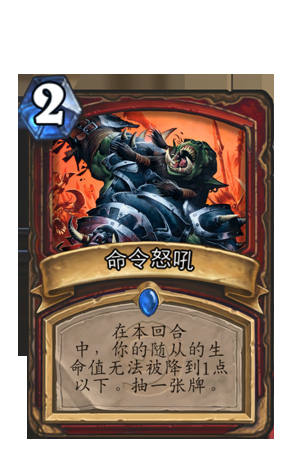 命令怒吼—— 在本回合中,你的随从的生命值无法被降到1点以下。抽一张牌。 只在你出牌的这个回合有效!最大的作用是用来保护自己的随从撞掉对方的。 |
