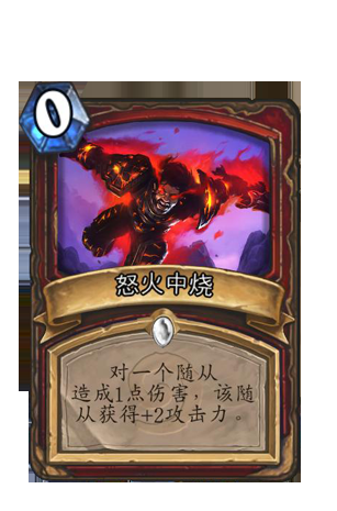怒火中烧—— 对一个随从造成1点伤害,该随从获得+2攻击力。 应用非常广泛,可以配合斩杀进行清除工作,也可以处理掉低血随从。当然最主要的还是用来激怒自己的随从。 |