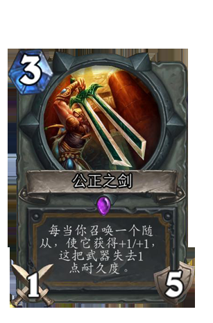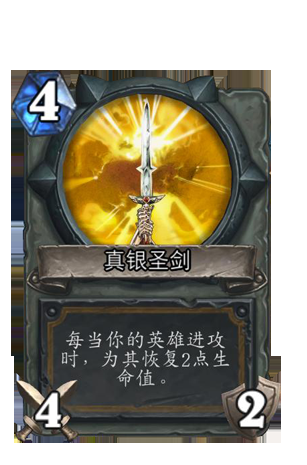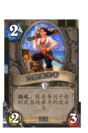 公正之剑 + 血帆袭击者 或 真银圣剑 + 血帆袭击者 + 保护之手 公正能将血帆袭击者强化到4/4,而真银能带来6/3的海盗(低血高仇恨需要圣盾保护)。 无论分轮打出还是一回合效果都很好,但需要注意的是要先打出武器再打出海盗。 而恐怖海盗的属性太过中庸所以不考虑。 |