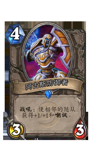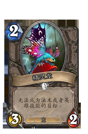公正之剑 + 精灵龙 + 阿古斯防御者 = 5/4嘲讽精灵龙 + 4/4阿古斯防御者 一轮打出需要9点蓝,推荐依次分轮打出,由于精灵龙不能被英雄单体技能攻击到的特性,被强化的5/4高属性嘲讽精灵龙会让对方非常头疼。 |