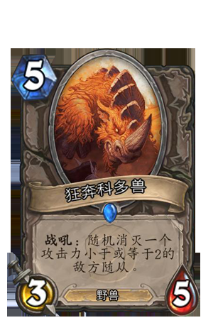 另一套圣骑单体秒杀技能 ,狂奔科多兽秒杀低于2点攻击的随从特性配合圣骑降攻击的法术、随从简直天衣无缝,且无视圣盾。 当然如果对方还有其他的2攻以下随从,慎用。 |