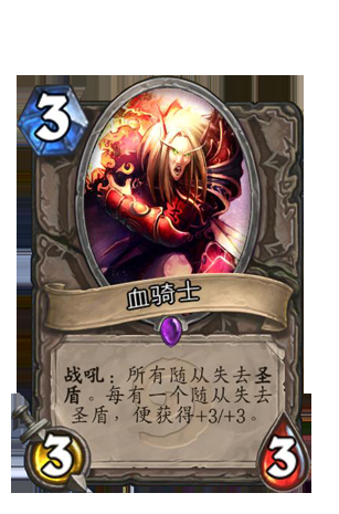 圣骑是唯一一个能给随从释放圣盾的职业,而场上的每个圣盾都能给血骑士带来3/3的加成,这样一套能够带来一个12/12的怪物。 当然也可分开使用,1个圣盾就能带来第三轮的6/6血骑士依然超值。 |