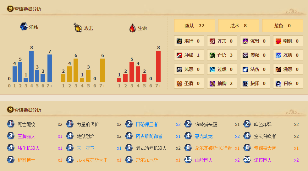 卡组分析:对于巨人术,我的观点是巨人术就是一个中期卡组,利用中期低费用下的高质量生物赚取大量的节奏,但是火车王之后的巨人术开始不带斩杀,很 多时候站住场了也要2个回合甚至3个回合才能结束比赛,所以我加入了强化机器人和双力代,相应的加入去力代相性非常高的女王,去除了被动的上古守护者和暗影烈焰、灵魂虹吸,只要站住一回合场基本就宣告胜利。