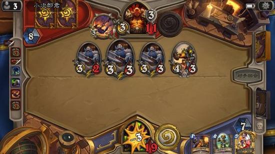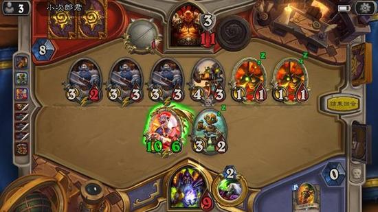 在本回合放任何随从之前要考虑的不仅是本回合我们能占多少优势,还要考虑到对方回合要怎样出牌,如对阵德鲁伊的过程之中,我方先手4费小鬼爆破可以打对面飞刀,也可以场面随从进行交换,一般我要防一手对面的横扫,同理,战士的绝命,牧师的炸弹都是一样。