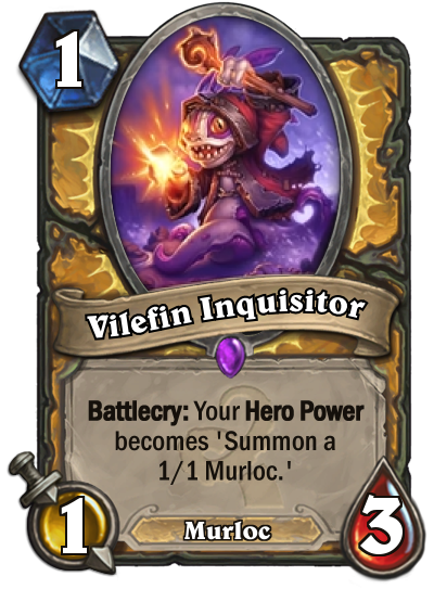 鱼人审问者——战吼效果将你的英雄能力改为“召唤一个1/1的鱼人”。英雄技能改为召唤一个鱼人,就目前而言这张卡并没有什么用,别跟我说什么死鱼骑士,你想到时候亡者归来复活一堆1/1的鱼人么?