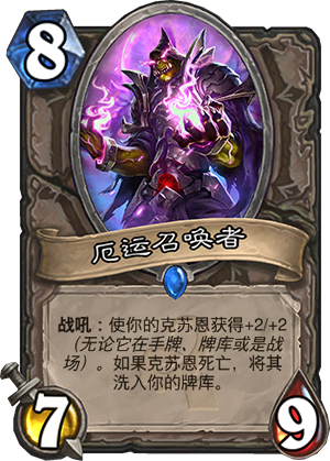 古神之一,召唤死亡的亡语随从。看来国外对于将来的亡语系列套牌较为看好?亡语贼、亡语猎或者其他职业也可以来一发?让我们拭目以待吧!