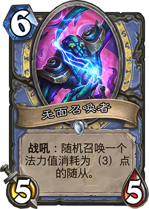 无面召唤者:这张卡出现在名单上可能没有人反对,它具有非常大的威胁,这张卡很容易让人联想到之前版本中的收割机,但这张卡的优势更在于他的效果是战吼而非亡语,你可以在场上立刻获得2个随从。此外,获得3费随从与2费随从的区别非常大,收割机掉出来的驾驶员很可能是2/1或1/1身材,甚至可能是末日预言者。但3费随从评价身材都是3/3,同时场上还有一个5/5身材是随从,在完美情况下,如果拉出剑圣或者穆克拉同时他们的战吼又不会触发将会让对手非常头疼。