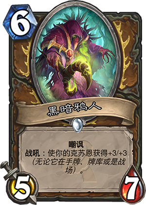 黑暗鸦人:黑暗鸦人这张卡出现在这个名单上的原因与血蹄勇士类似,在6费阶段的一个7血身材的嘲讽随从让同费用的卡很难解掉,对手往往需要用2张卡来解它。黑暗鸦人是克苏恩德必备的一张卡,通常的情况是熊德,然后黑暗鸦人BUFF克苏恩,7费下双子皇帝这三张强有力的墙,对手往往很难越过。在克苏恩德的卡组中,职业前期随便下1张BUFF克苏恩的卡在配一张+3/+3的黑暗鸦人就可以把BUFF到10点攻击力,虽然在6费曲线的时候你的克苏恩基本会有10点以上的攻击力,但黑暗鸦人的加入几乎是保证BUFF到10/10的一个随从。