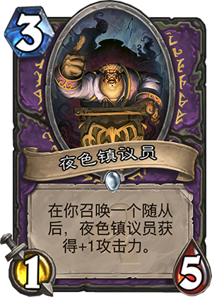 最后我们公布第一周古神牌中最后的一张——夜色镇议员。这张卡排在第一可能会让许多选手感到意外,一些选手甚至一开始并不看好它。但是这张卡加入动物园卡组之后表现出色。这张卡之所以优秀,是因为在动物园卡组中可以无限滚雪球,很多情况下这张卡能被BUFF到5点攻击力,最重要的是他在拥有5点生命值,对于3费回合来说很难解掉,着就让术士有足够的时间BUFF它。